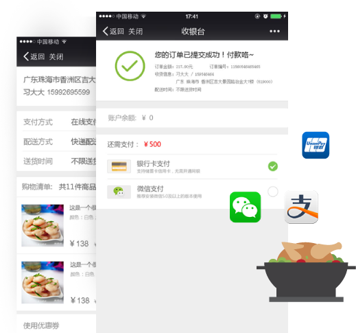 支持多种支付方式,微信钱包、支付宝、快 钱支付,实时对账完成交易